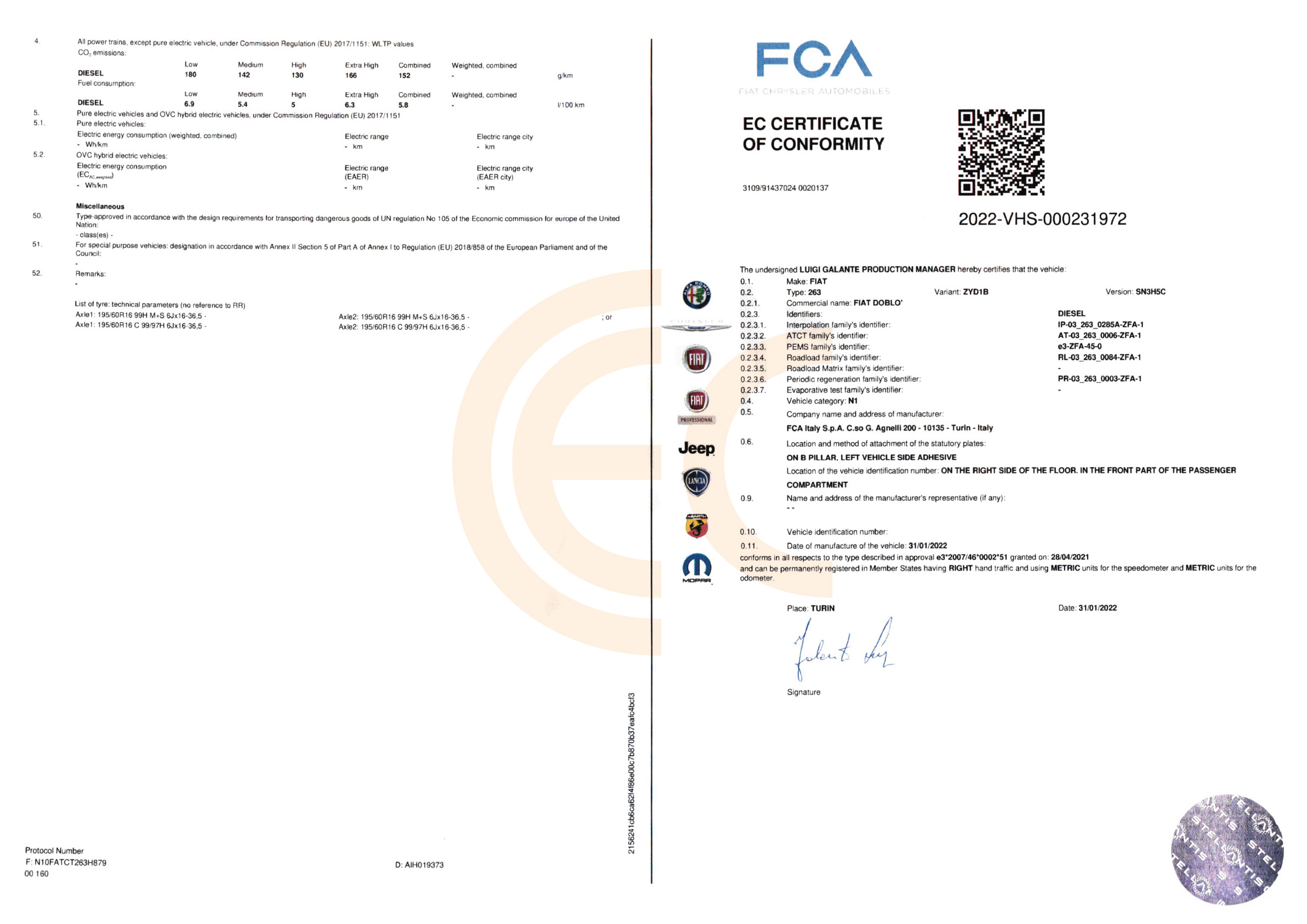 Get your official, authentic FIAT Certificate of Conformity (COC), recognized across all EU countries. This document proves your vehicle meets EU regulations and is required for registration or import in most European states. Issued by FIAT accepted by all authorities.