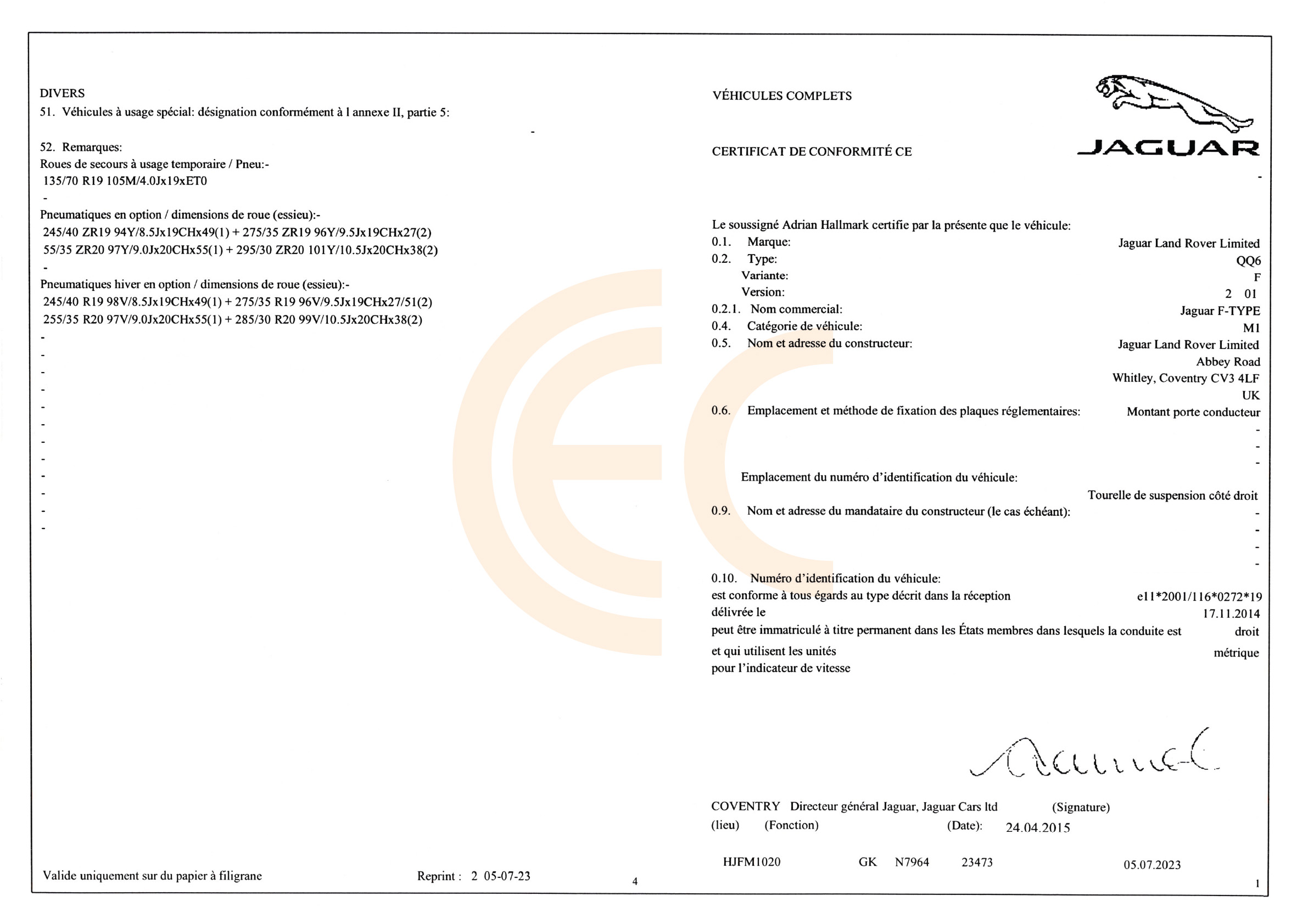 Get your official, authentic JAGUAR Certificate of Conformity (COC), recognized across all EU countries. This document proves your vehicle meets EU regulations and is required for registration or import in most European states. Issued by JAGUAR accepted by all authorities.