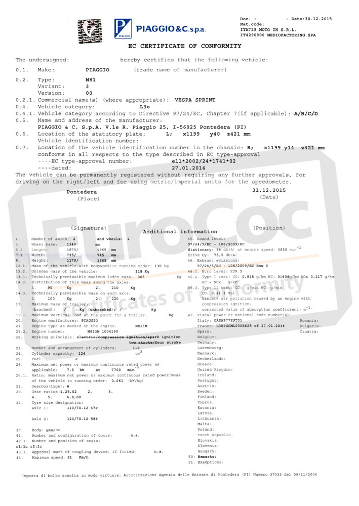 Get your official, authentic PIAGGIO Certificate of Conformity (COC), recognized across all EU countries. This document proves your vehicle meets EU regulations and is required for registration or import in most European states. Issued by PIAGGIO, accepted by all authorities.